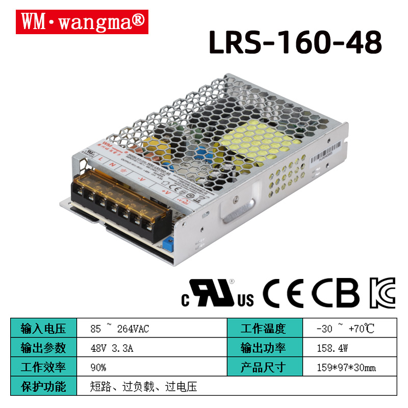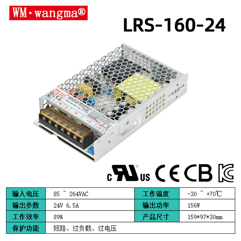 在工业自动化、智能安防、LED照明、小型工控设备等领域,电源作为设备的“动力心脏”,不仅需要稳定可靠的供电能力,更要适配日益紧凑的设备安装空间,兼顾高效节能与耐用性。旺马电子推出的WM-LRS160超薄开关电源,正是针对紧凑型供电需求打造的160W级高性能产品,凭借极致轻薄机身、宽压适配、多重防护和长效稳定的特性,成为中小功率工业供电场景的优选方案,完美平衡了体积、性能与性价比。