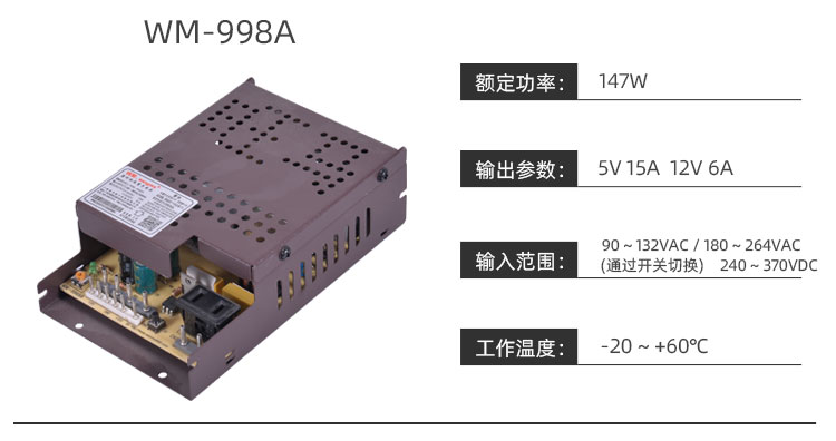 WM-998A是旺马电子推出的游乐设备专用电源,适配街机、娃娃机等设备,WM-998A电源具备短路保护、过充电保护功能,可有效保障设备安全运行。