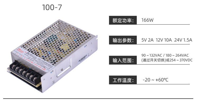 输入范围:90 ~ 132VAC / 180 ~ 264VAC(通过开关切换)或254~370VDC